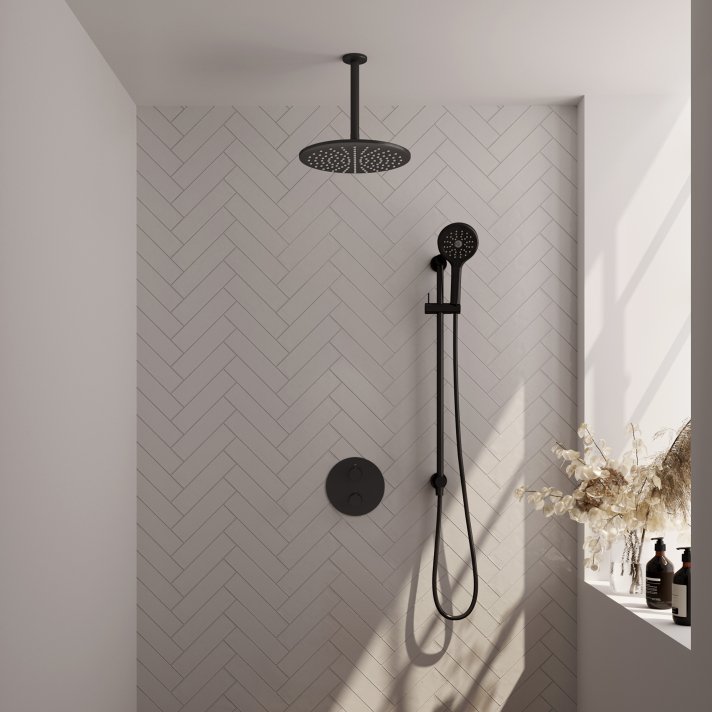 BRAUER Black Edition thermostatische inbouw regendouche 3-weg rond SET 96 met 30 cm douchekop en plafondarm en 3-standen handdouche en doucheslang en geïntegreerde glijstang mat zwart