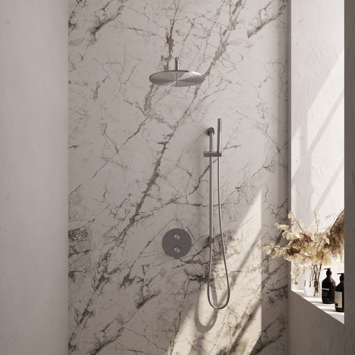 BRAUER Brushed Carving thermostatische inbouw regendouche 3-weg rond SET 88 met 30 cm douchekop en gebogen muurarm en staaf handdouche en doucheslang en geïntegreerde glijstang RVS geborsteld PVD