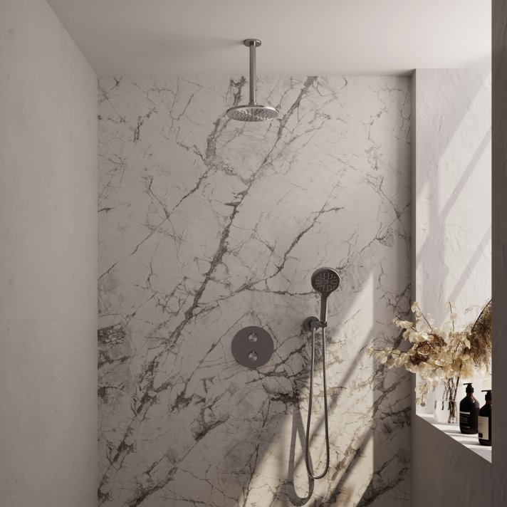 BRAUER Brushed Edition thermostatische inbouw regendouche 3-weg rond SET 83 met 20 cm douchekop en plafondarm en 3-standen handdouche en doucheslang en wandaansluitbocht RVS geborsteld PVD