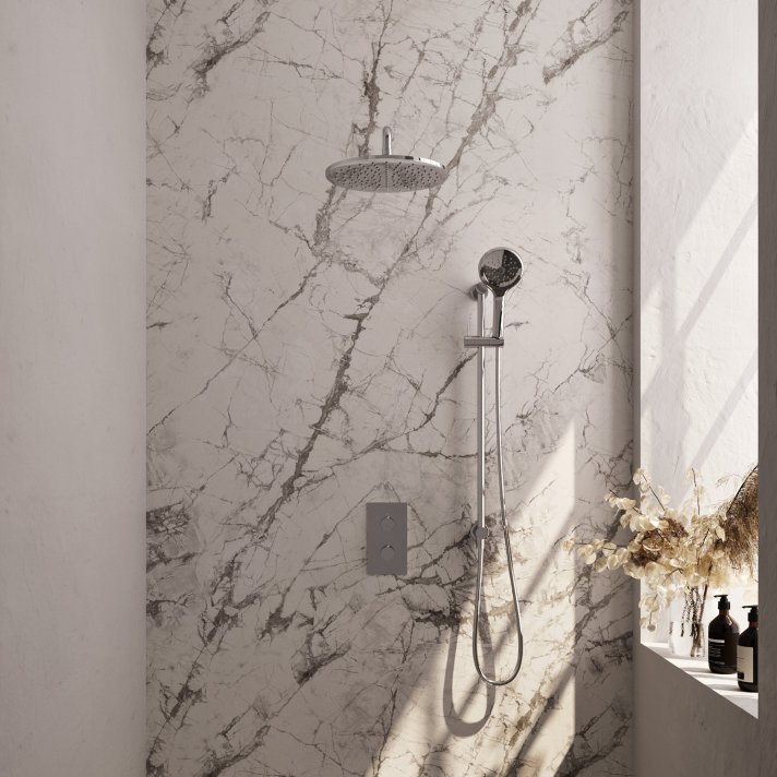 BRAUER Chrome Carving thermostatische inbouw regendouche 3-weg omstelling SET 46 met 30 cm douchekop en gebogen muurarm en 3-standen handdouche en doucheslang en geïntegreerde glijstang chroom