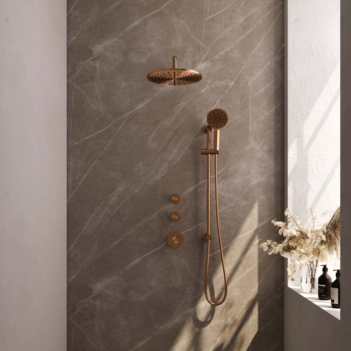 BRAUER Copper Edition thermostatische inbouw regendouche SET 22 met 30 cm douchekop en gebogen muurarm en 3-standen handdouche en doucheslang en geïntegreerde glijstang koper geborsteld PVD
