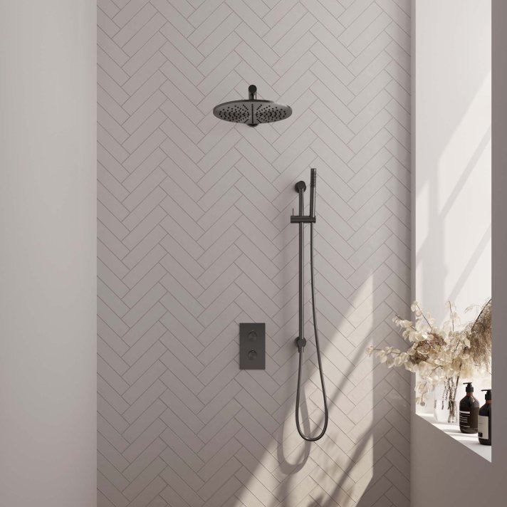 BRAUER Gunmetal Carving thermostatische inbouw regendouche 3-weg omstelling SET 38 met 30 cm douchekop en rechte muurarm en staaf handdouche en doucheslang en geïntegreerde glijstang gunmetal geborsteld PVD
