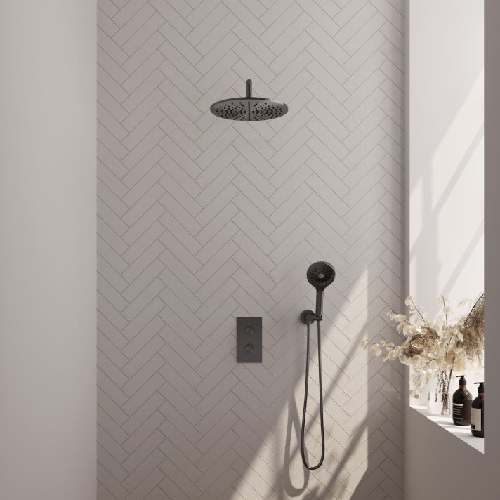BRAUER Gunmetal Edition thermostatische inbouw regendouche 3-weg omstelling SET 34 met 30 cm douchekop en gebogen muurarm en 3-standen handdouche en doucheslang en wandaansluitbocht gunmetal geborsteld PVD