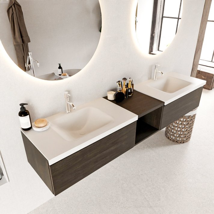 Mondiaz Bukla 200cm badmeubel met open module 40 kleur Dark Brown met 2 lades. Wastafel Cloud dubbel 2 kraangaten kleur Talc.