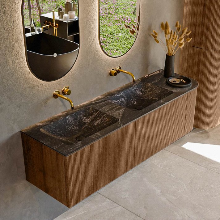 Mondiaz Kurve-Dlux 155cm badmeubel ronding Rechts kleur Walnut met 2 lades en 1 deur. Wastafel Leaf Dubbel / Links zonder kraangat Lava.