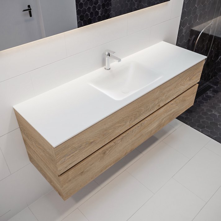 Mondiaz Vica 150 badmeubel washed oak 2 lades wastafel Cloud midden 1 kraangat