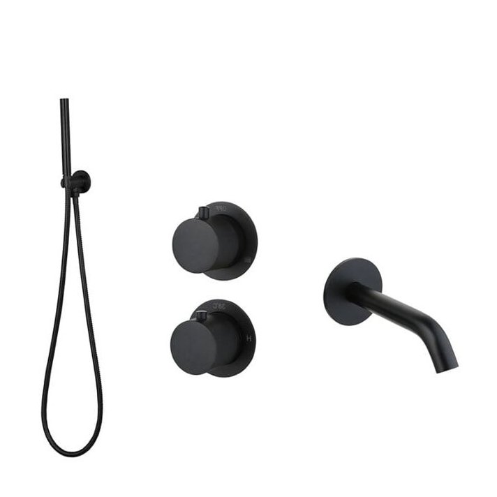 Sani DeLuxe Badset inbouw met box thermostaat, muurbevestiging / doucheslang, staafhanddouche / afwerkringen / rond Mat Zwart met geribbeld knop